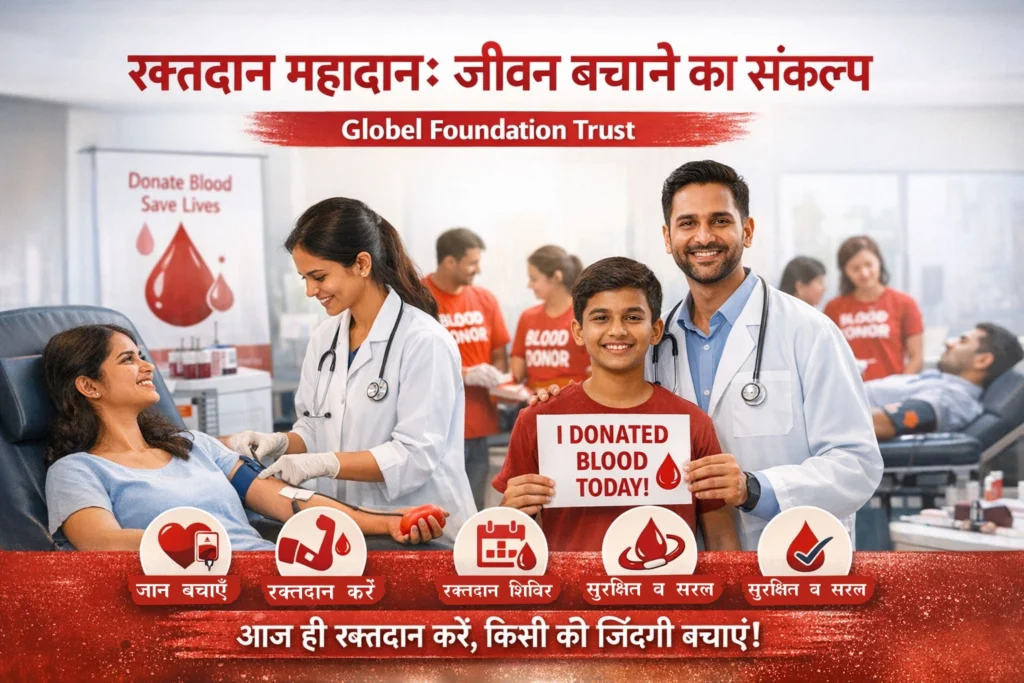 Globel Foundation Trust द्वारा चलाया जा रहा यह रक्तदान जागरूकता अभियान लोगों को रक्तदान के महत्व के प्रति जागरूक करने और जरूरतमंद मरीजों तक समय पर रक्त पहुँचाने के उद्देश्य से शुरू किया गया है। आपका साथ—किसी की जिंदगी बचा सकता है।